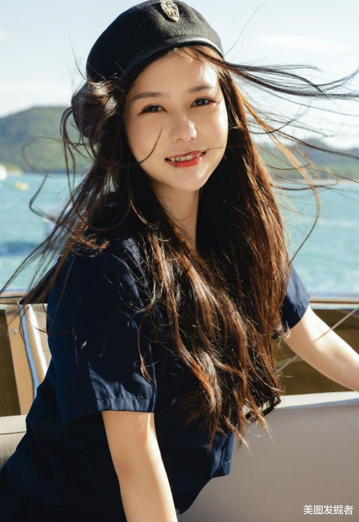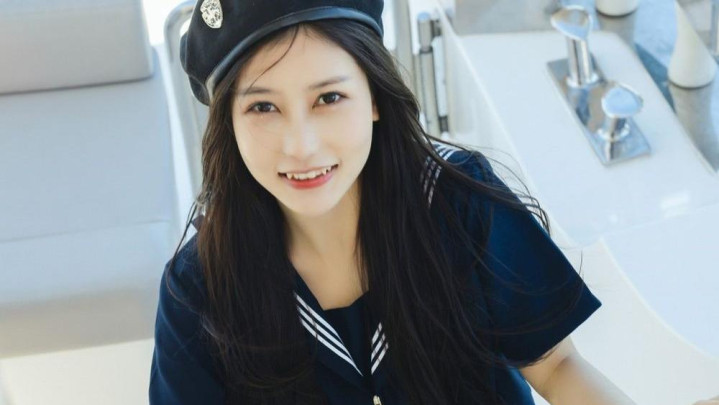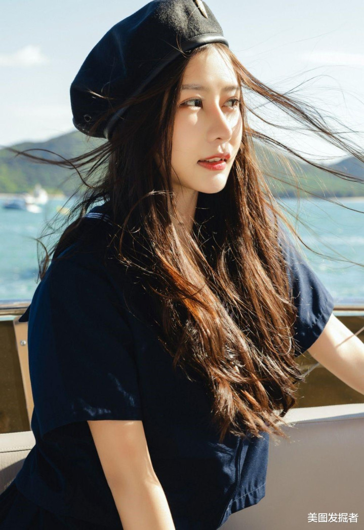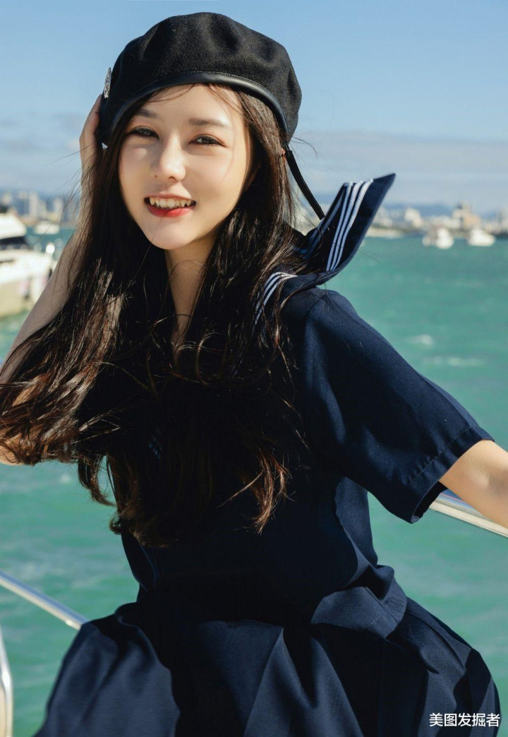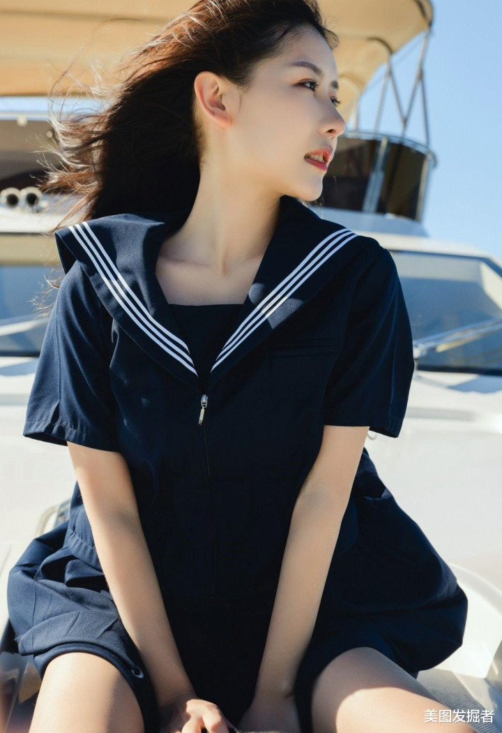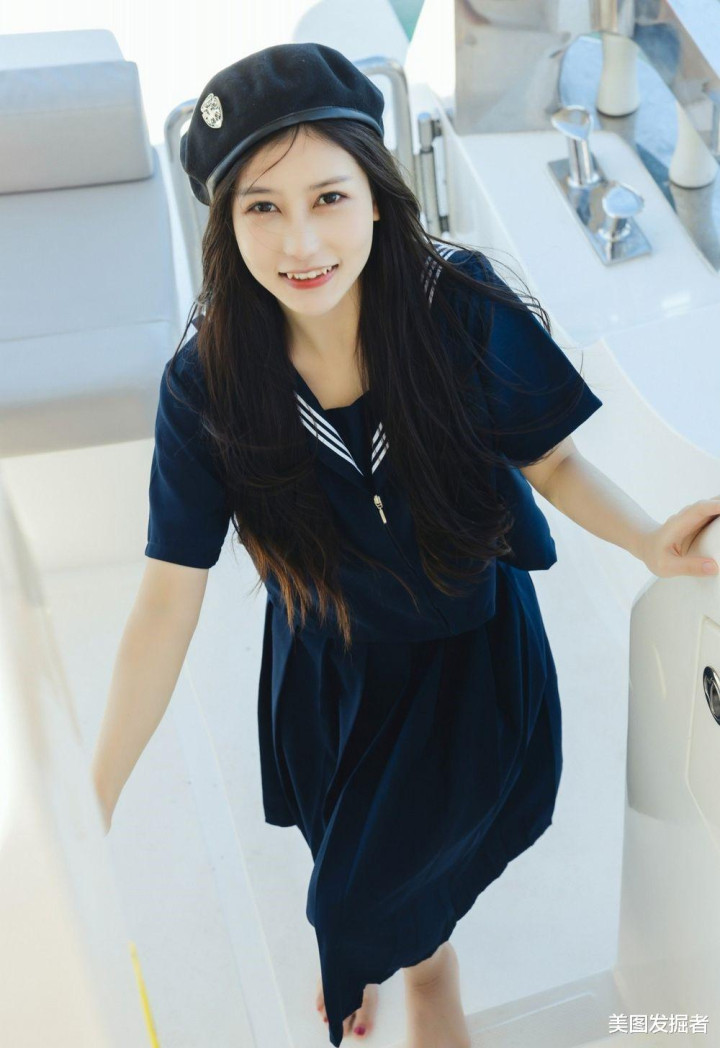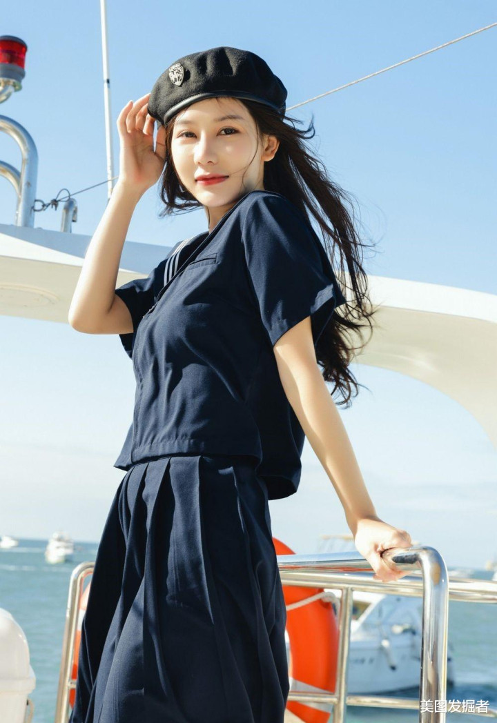 深蓝色水手服上衣勾勒出挺拔身姿,高腰A字短裙秀出笔直长腿,黑色贝雷帽微倾增添俏皮感。站在游艇甲板上,海风掀起衣角与长发,清纯中透着性感,尽显黄金比例身材与元气魅力。